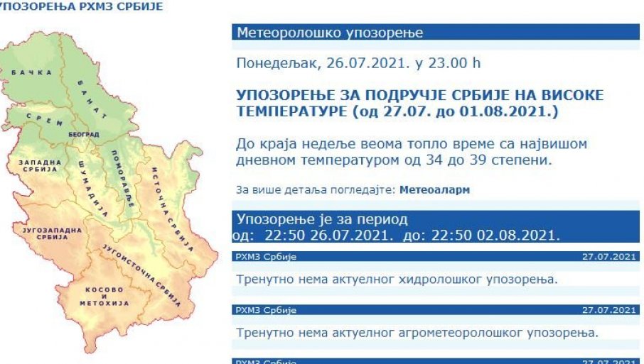 ПОЧИЊЕ ЈОШ ЈЕДАН ТРОПСКИ ТАЛАС: РХМЗ упозорава на веома топло време - упаљен метео аларм