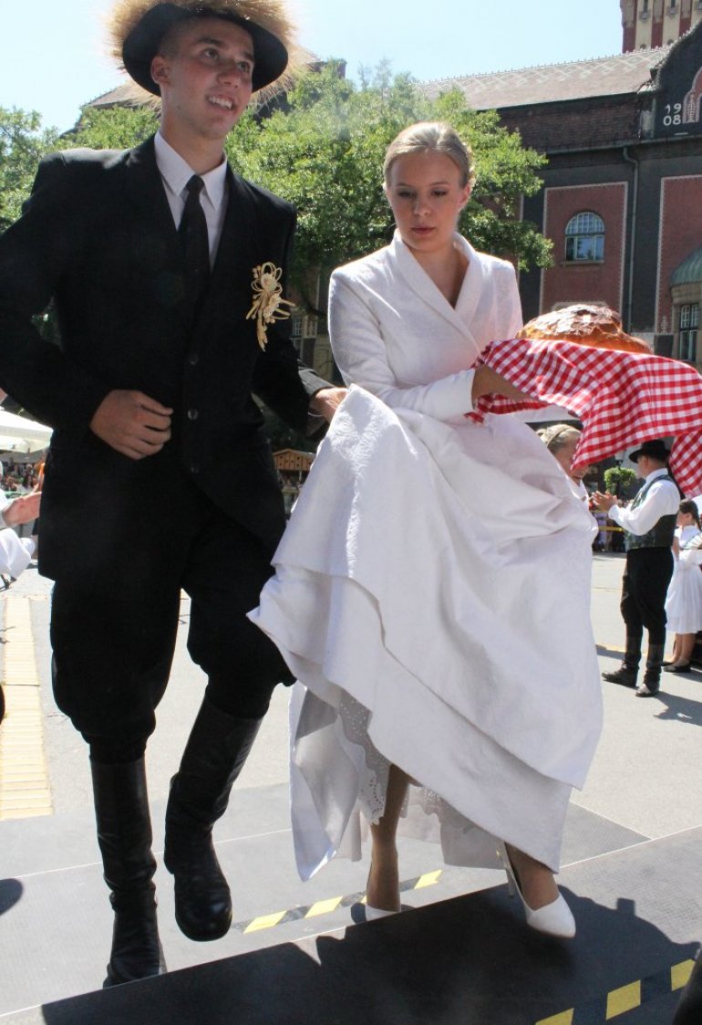 "Дужијанце". Како обичај налаже, хлеб од овогодишњег рода пшенице градоначелнику Стевану Бакићу предали су бандаш и бандашица Данијел Кујунџић и Кристина Матковић.