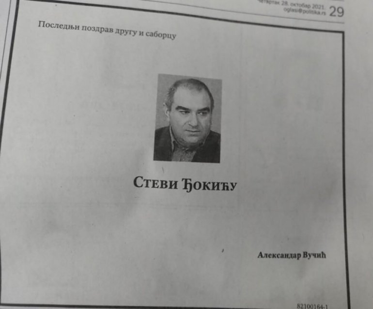 – Последњи поздрав другу и саборцу, Стеви Ђокићу – написано је у читуљи која је потписана председниковим именом и презименом.