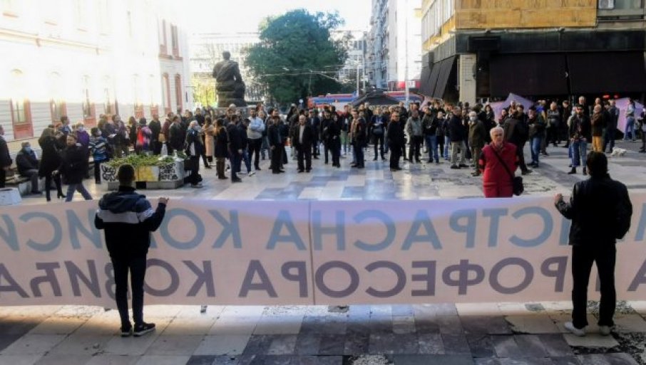 У 11 часова почео је протест на платоу испред Филозофског факултета у знак подршке професору Милошу Ковићу коме прети избацивање са факултета.