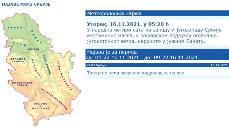 - У наредна четири сата на западу и југозападу Србије местимично магла, у кошавском подручју појачање југоисточног ветра, нарочито у јужном Банату - стоји на сајту РХМЗ.
