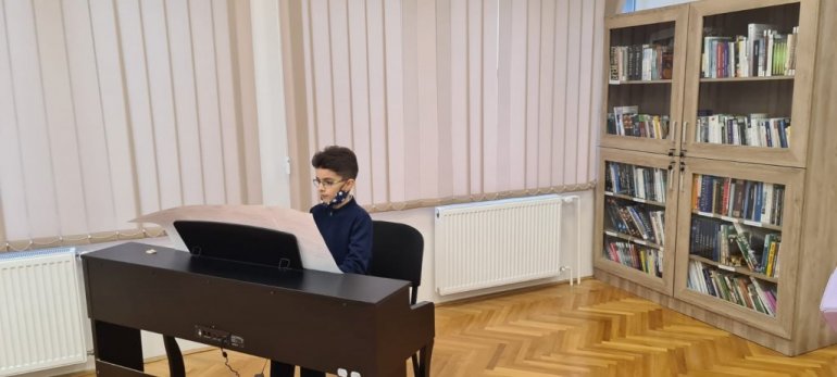 БОШКО Алексић (9) ученик другог разреда музичке школе у Јавној библиотеци у Дољевцу данас увежбава клавирску нумеру пред долазак председника Вучића.