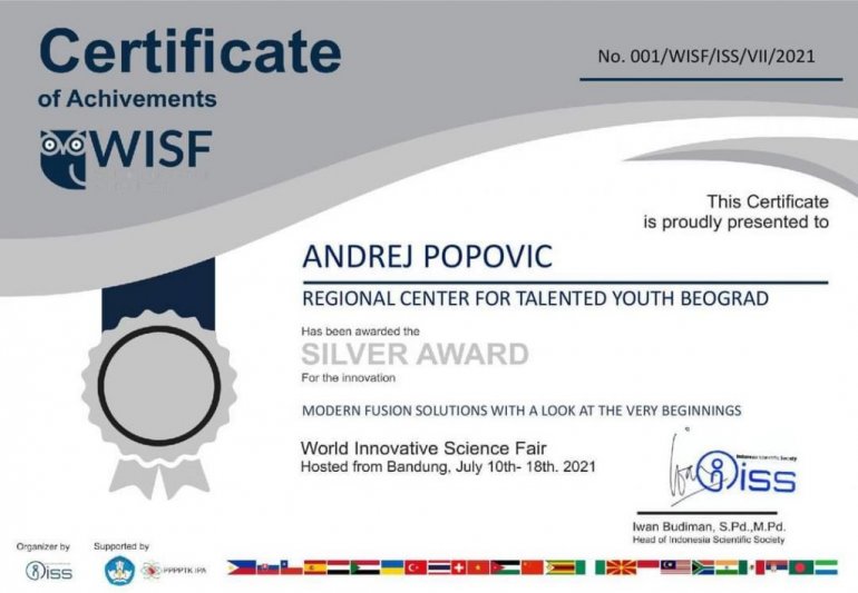 На Светској смотри истраживачких радова младих научника у Индонезији летос је освојио сребрну медаљу за рад "Савремена решења фузије са освртом на саме почетке". Због тога је недавно и добио награду Српске академије наука и уметности. Родитељи су поново били збуњени, али су сада брже схватили да то прихвате као реалност и схватили шта му је пасија.