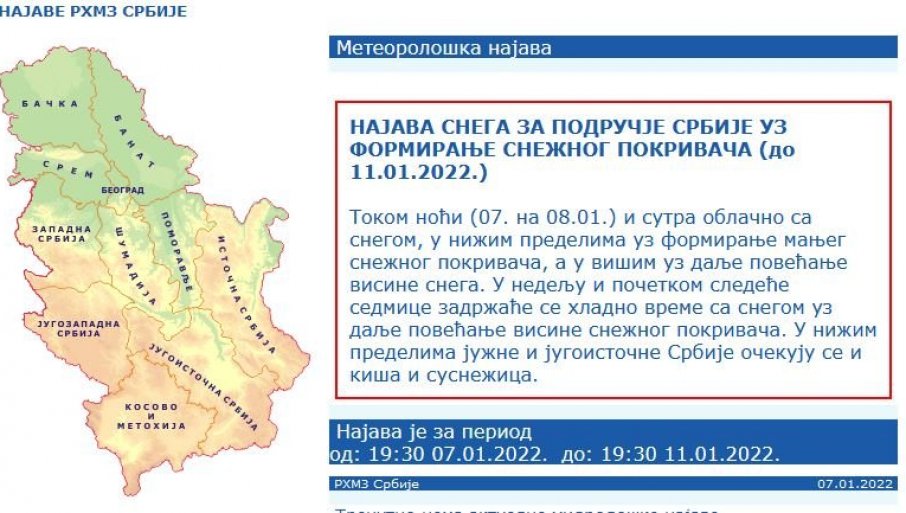 РЕПУБЛИЧКИ хидрометеоролошки завод вечерас је објавио најаву снега за подручје Србије уз формирање снежног покривача.