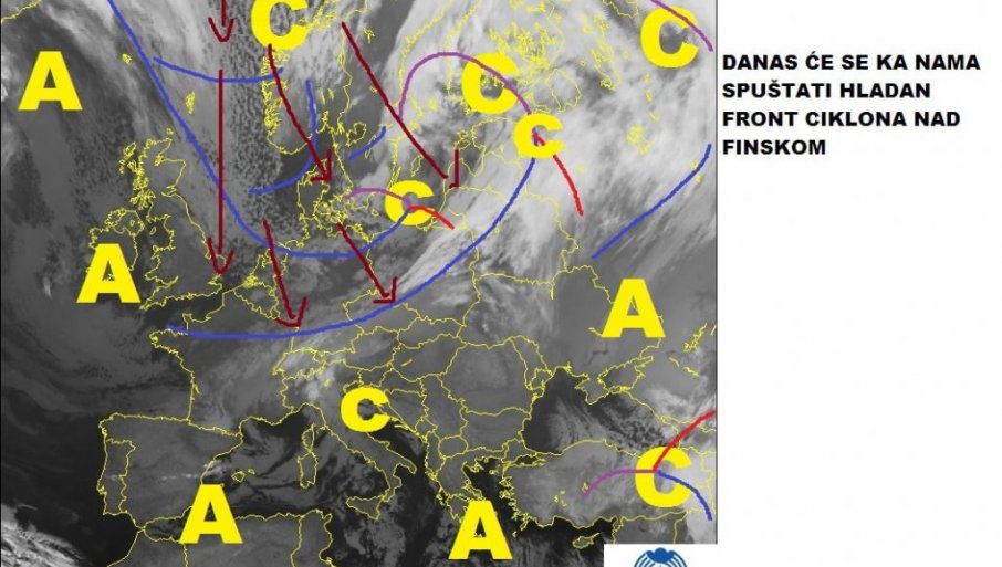 - Ка нама се са северозапада приближава хладан фронт циклона над Финском, који ће прво захватити северозападне и севене пределе Србије и Хрватске, да би се у току ноћи преместио преко већег дела региона.