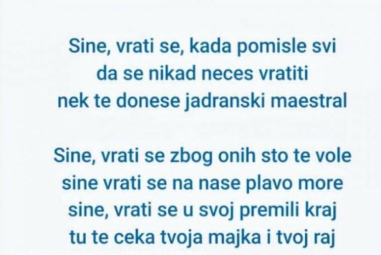 – Сине, врати се, када помисле сви да се никада нећеш вратити нека те донесе јадрански маестрал. Сине, врати се због оних што те воле, сине врати се на наше плаво море, сине врати се у свој премили крај, ту те чека твоја мајка и твој рај – пише у поруци.