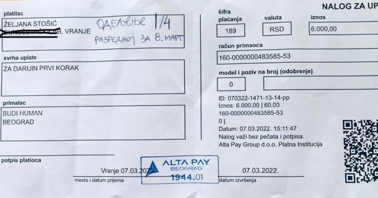 Наиме, они су својој разредној поклонили уплатницу која је доказ да су новац који су наменили за њен поклон уплатили у хуманитарне сврхе и потписали се како би она имала лепу успомену.