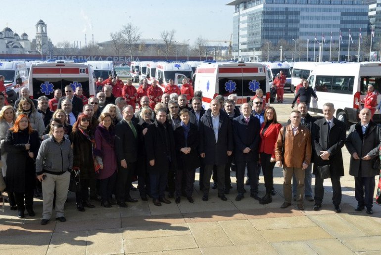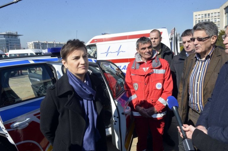 Премијерка је прво прегледала нова возила, која ће бити предата службама хитне помоћи у Србији. Међу возилима се налазе и специјални санитети за људе који су на дијализи, које су добили и институти за рехабилитацију.