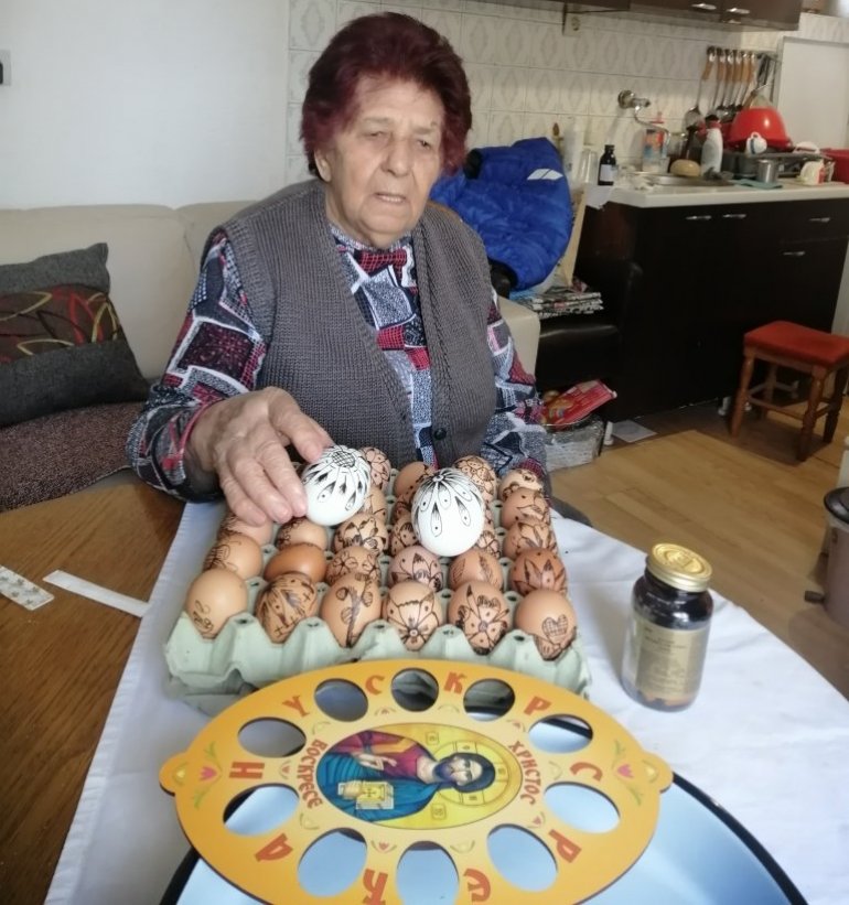 - Њену "обуку" је прошло на стотине девојчица и из околних села, попут Козјака, Брадића, Јадранске Лешнице, Трбосиља, Милине, Јошеве, Текериша... Јаја смо шарали, као и сад, до Великог петка, а на тај дан практикујемо кување и бојење. Највише је, наравно, црвених, а ретко које нема и исписана слова ХВВВ, што је скраћеница од традиционалног поздрава: "Христос васкрсе - Ваистину васкрсе". Иначе, за исцртавање мотива на јајима користим шараљку са пером, восак и свећу на којој га отапам. Кувају се кокошија, али и друга јаја, попут знатно већих гушчијих, на пример, а у воду се додају коприва и млечика - вели бака Марица која је највећа јаја, дар породице Миливојевић из Корените, украсила и наменила својим праунукама Ангелини и Дуњи...