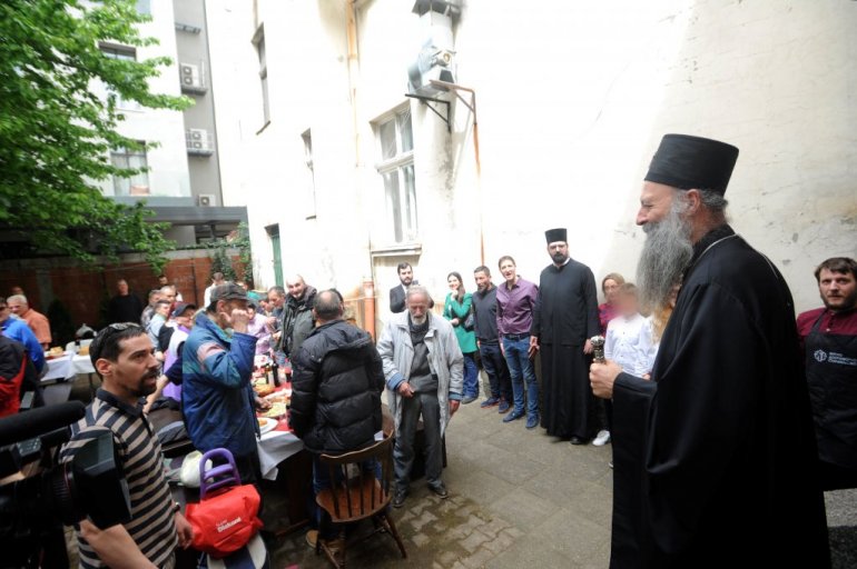 ПАТРИЈАРХ ПОРФИРИЈЕ РУЧАО СА БЕСКУЋНИЦИМА: Најрадоснији хришћански празник провео у кухињи Верског добротворног старатељства (ФОТО)