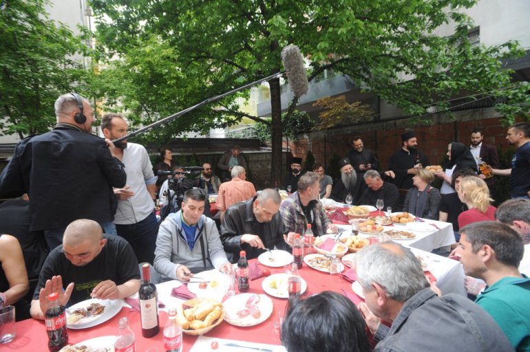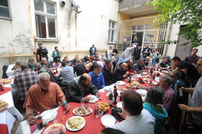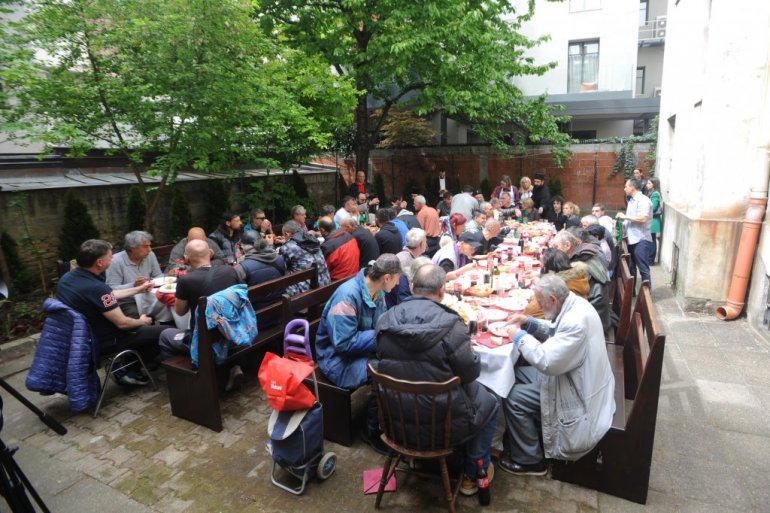 У дворишту црквене кухиње Верског добротворног старатељства патријарха су за столом сачекали корисници, већина без крова над главом.