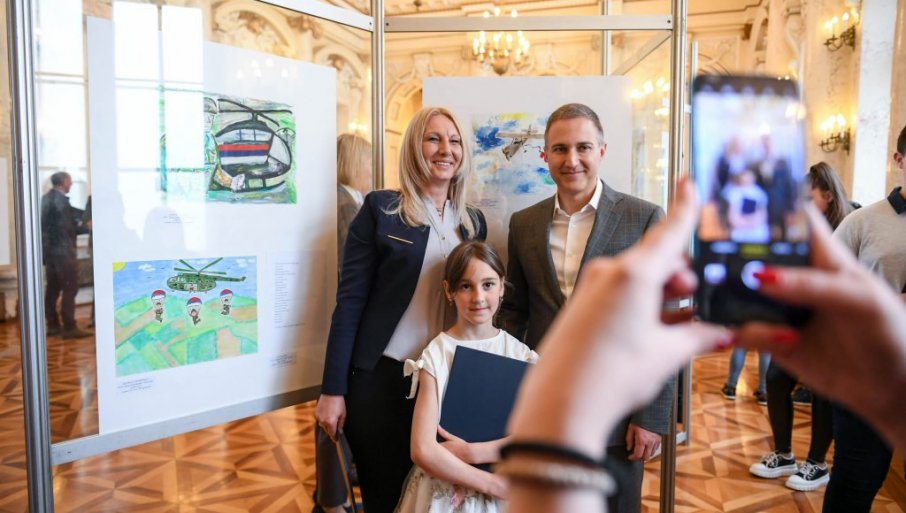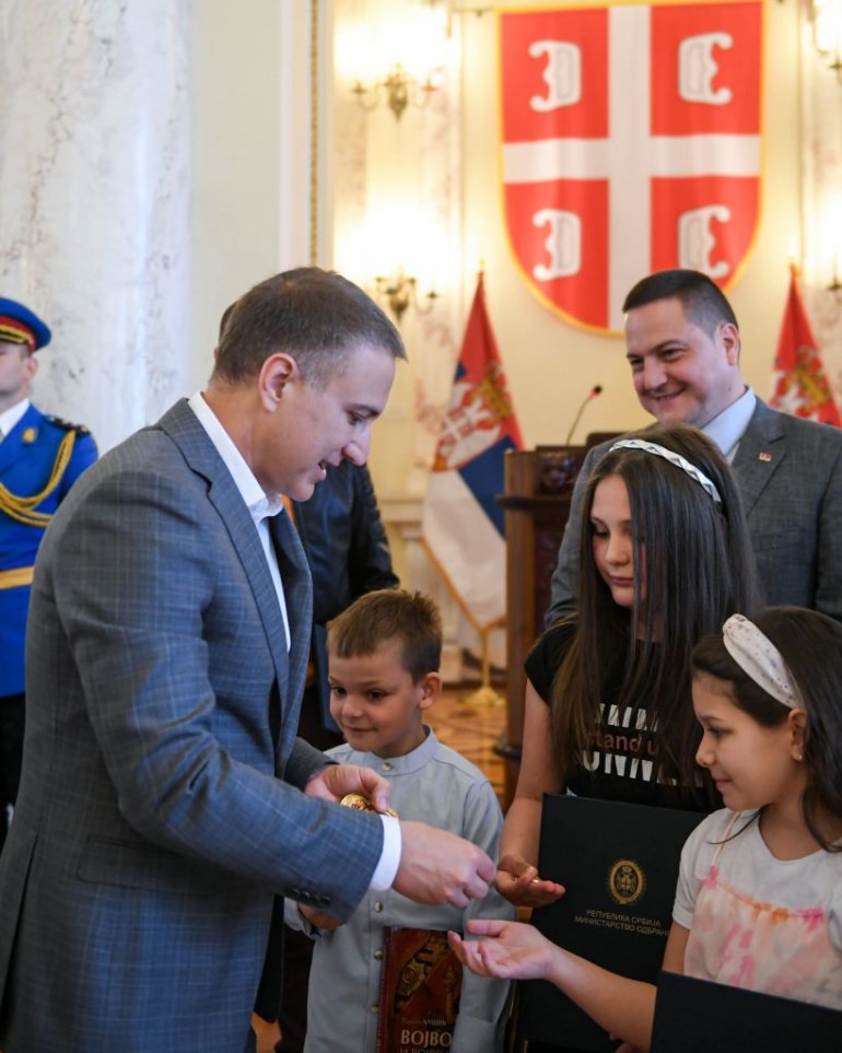 - Хтели смо да конкурс овога пута буде посвећен нашим пилотима, заштитницима нашег неба, и да вам награде уручимо у овој великој сали Министарства одбране - да видите ово културно благо Србије. Желели смо да вам покажемо и колико је тежак војнички посао, али и колико је леп, као и колико је важно све оно што наши војници штите, колико је важно што чувају нашу Србију – рекао је министар Стефановић обраћајући се награђеним малишанима.