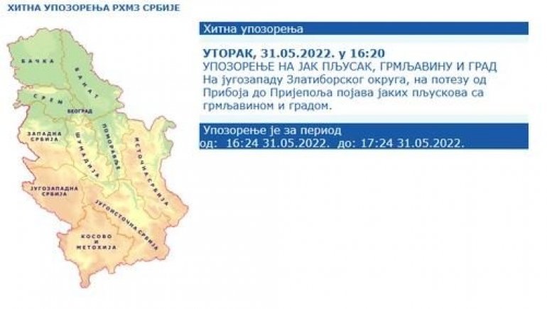 Републички хидрометеоролошки завод издао је упозорење на јак пљусак, грмљавину и град на југозападу Златиборског округа, на потезу од Прибоја до Пријепоља.