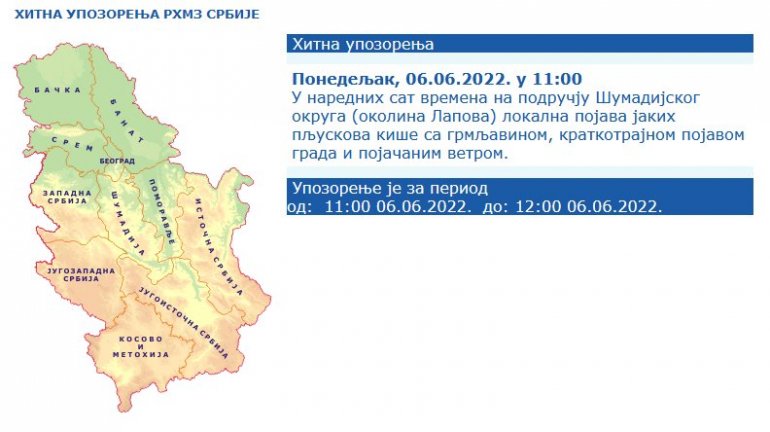 Пљускови и грмљавине који се очекују у периоду од 6. до 10. јуна 2022. године локално ће бити праћени градом, јаким ветром и количином падавина већом од 20 мм за кратко време.