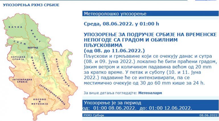 Републички хидрометеоролошки завод издао је током ноћи упозорење које се односи на целу територију Србије и најављује непогоде са градом и обилним пљусковима. - Пљускови и грмљавине који се очекују данас и сутра (8. и 9. јуна 2022) локално ће бити праћени градом, јаким ветром и количином падавина већом од 20 мм за кратко време.