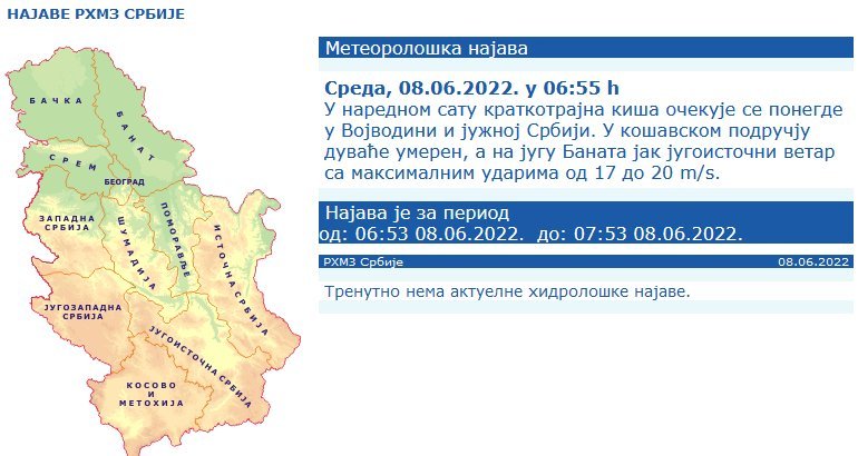 - У наредном сату краткотрајна киша очекује се понегде у Војводини и јужној Србији. У кошавском подручју дуваће умерен, а на југу Баната јак југоисточни ветар са максималним ударима од 17 до 20 м/с - стоји у овој најави РХМЗ-а.