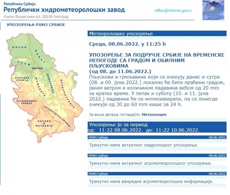 Такође, у упозорењу се наводи да су могуће временске непогоде са градом и обилним пљусковима од 8. до 11. јуна.