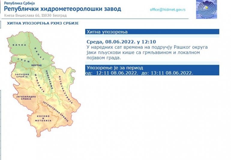 На сајту Републичког хидрометеоролошког завода објављено је хитно упозорење где се у наредних сат времена најављује невреме на подручју Рашког округа.