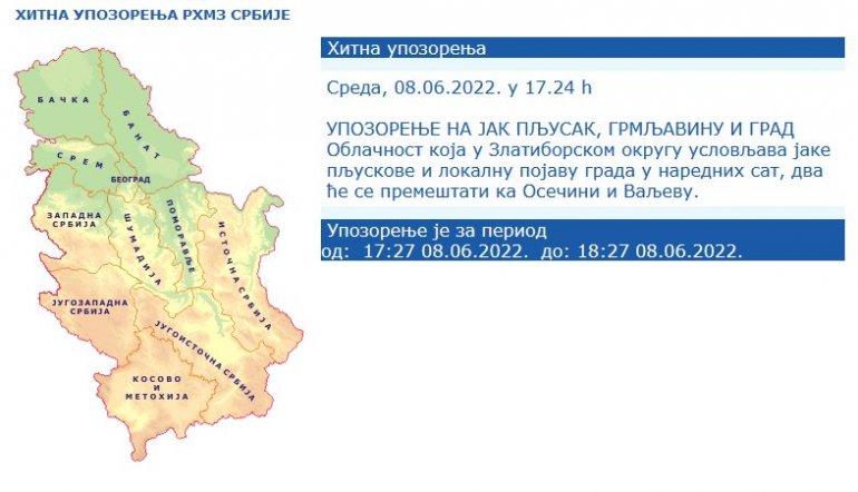 РЕПУБЛИЧКИ хидрометеоролошки завод издао је упозорење на јак пљусак, грмљавину и град.