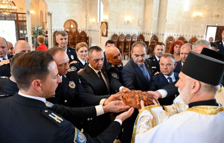 Министар полиције Александар Вулин претходно је присуствовао обележавању славе Министарства унутрашњих послова Света Тројица и сечењу славског колача у цркви Светог Симеона Мироточивог у Новом Београду.