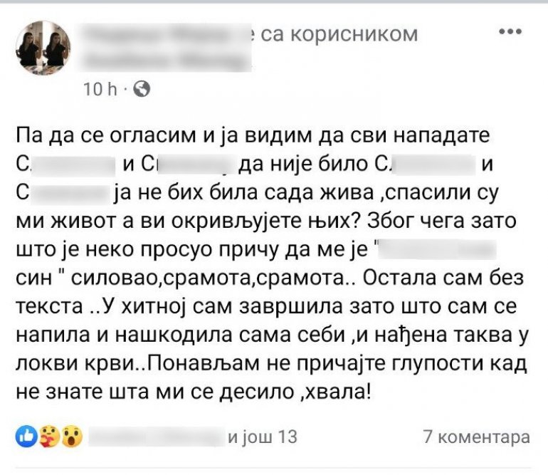 - Па да се огласим и ја, видим да сви нападате С. и С., а да није било њих ја сада не бих била жива, спасили су ми живот а ви окривљујете њих? Због чега, зато што је неко просуо причу да ме је С. син силовао, срамота, срамота... Остала сам без текста. У хитној сам завршила зато што сам се напила и нашкодила сама себи, и нађена таква у локви крви... Понављам, не причајте глупости кад не знате шта ми се десило, хвала - написала је девојчица на Фејсбуку.