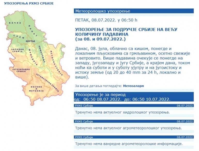 СУБОТА 9. 7. 2022: Облачно, местимично са кишом, понегде и са пљусковима и грмљавином, а више падавина се очекује ујутро и пре подне на југу и истоку земље. После подне и увече престанак падавина и постепено разведравање. Ветар умерен и јак, северозападни. Јутарња температура од 14 до 18, а највиша дневна од 18 на југу и југоистоку до 26 степени на северозападу Србије. Упозорење: Количина падавина већа од 30 л/м² за 12 ч, вероватноћа 80%. Локална појава грмљавина, вероватноћа 90%.