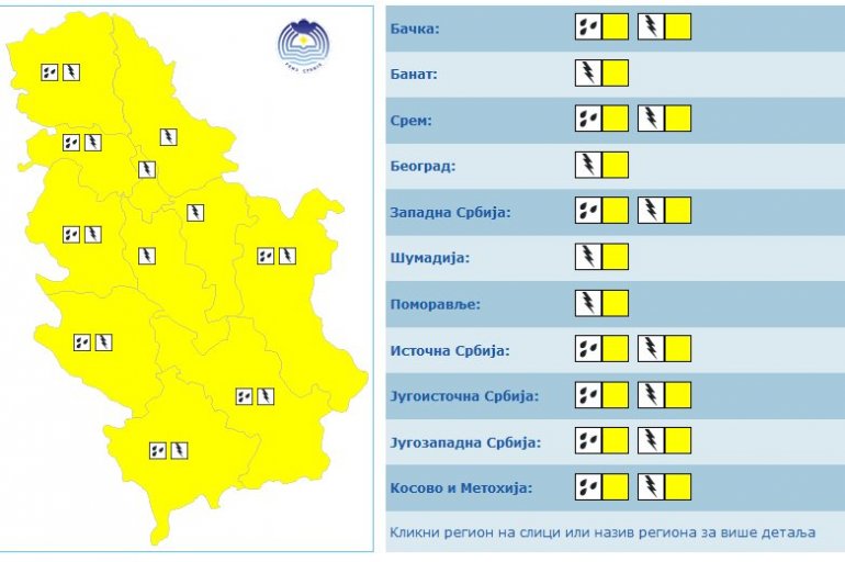 На територији целе Србије на снази је жути метеоаларм, што значи да време може бити опасно.
