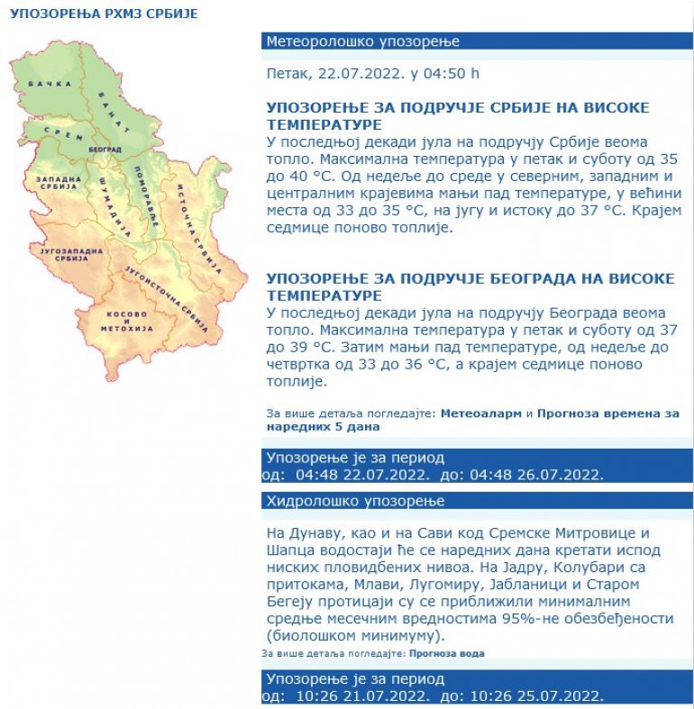 УПОЗОРЕЊЕ ЗА ПОДРУЧЈЕ СРБИЈЕ НА ВИСОКЕ ТЕМПЕРАТУРЕ