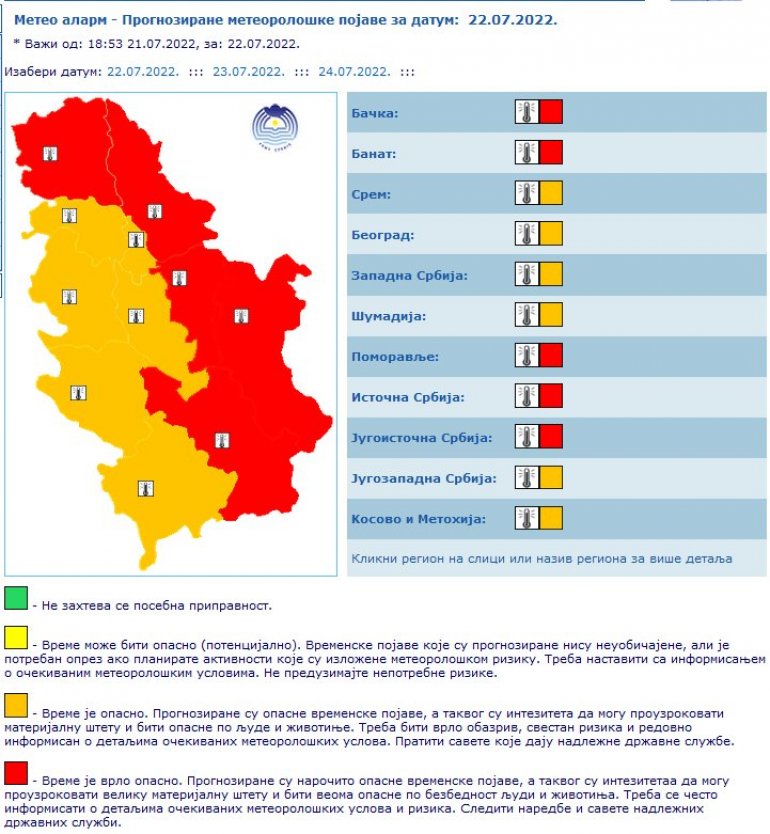 Због екстремно високих температура данас је на територији Србије упаљен наранџасти и црвени метеоаларм.