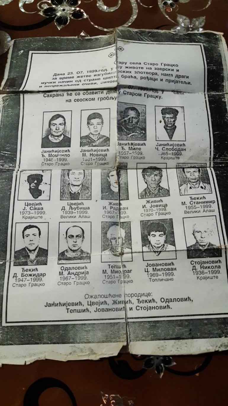 - Од тог петка по подне до среде када су нам тек дозволили да преузмемо ковчеге са њиховим телима, само је кукњава одјекивала селом. Додатна бол нам је била што нам војници Кфора нису ни дозволили да отворимо лимене сандуке и опростимо се последњи пут са њима, јер су били унакажени - јецајући прича ова жена, док подсећа да су парастос на сахрани служили блаженопочивши патријарх Павле, митрополит Амфилохије и владика Атанасије. И док опомиње да су на њиви убијени и синови јединци Андрија Одаловић (30) и Саша Цветић (29), мештани овог страдалничког села опомињу да су зликовци оставили бака Љубицу Живић без два сина, Јовице (29) и Радована (30), али и седморо деце без ова два оца...