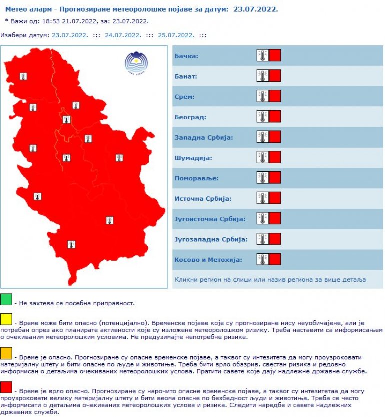 ЗБОГ високих температура у целој Србији на снази је црвени метео-аларм, што значи да је време врло опасно.