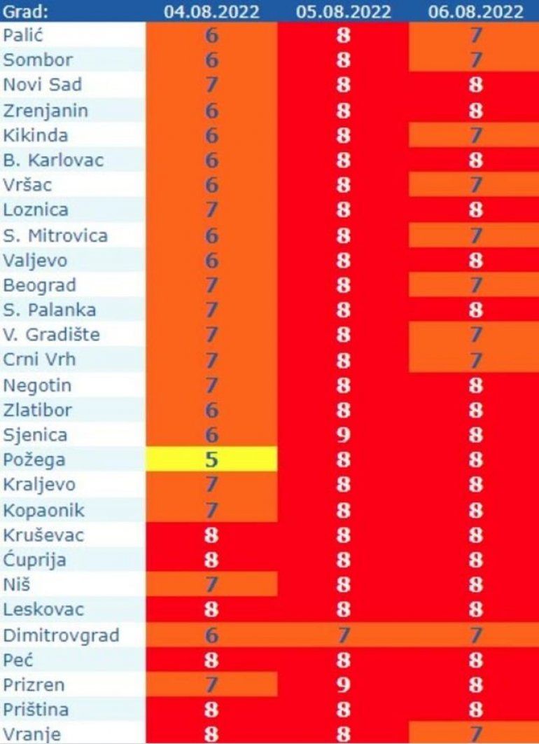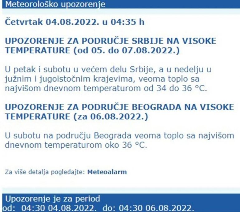 Иначе, РХМЗ је издао и два упозорења на високе температуре, једно за Србију и друго посебно за Београд.