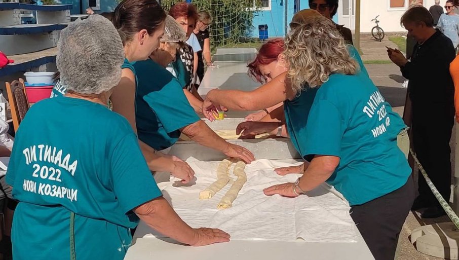 - Данас је цело наше село мирисало на питу. Нас петнаестак жена је направило питу за Гиниса и можемо да будемо поносне, јер је дуга 30,5 метара и дужа је 45 центиметара од претходне коју смо правиле пре две године. "Питијада" се није одржавала претходне две године због епидемије короне, али смо ове године поново умесиле наш специјалитет. Кад се наше руке сложе, пита мора да буде добра и укусна. Утрошиле смо 20 килограма брашна, исто толико кромпира, осам литара уља, четири килограма лука и пет кесица бибера. Још се дода само со, јер наша кромпируша не сме да има никакве друге састојке - открила нам је Боја Ољача, председница Удружења жена из Нових Козараца.