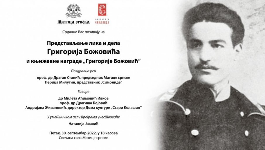 У СВЕЧАНОЈ сали Матице српске вечерас у 18 сати биће представљени лик и дело Георгија Божовића (Придворица, код Колашина, 1880 – Београд, 1945) књижевника, новинара и народног посланика. У организацији Матице и Фондације Симонида овом приликом биће промовисана и књижевна награда која носи Божовићево име.