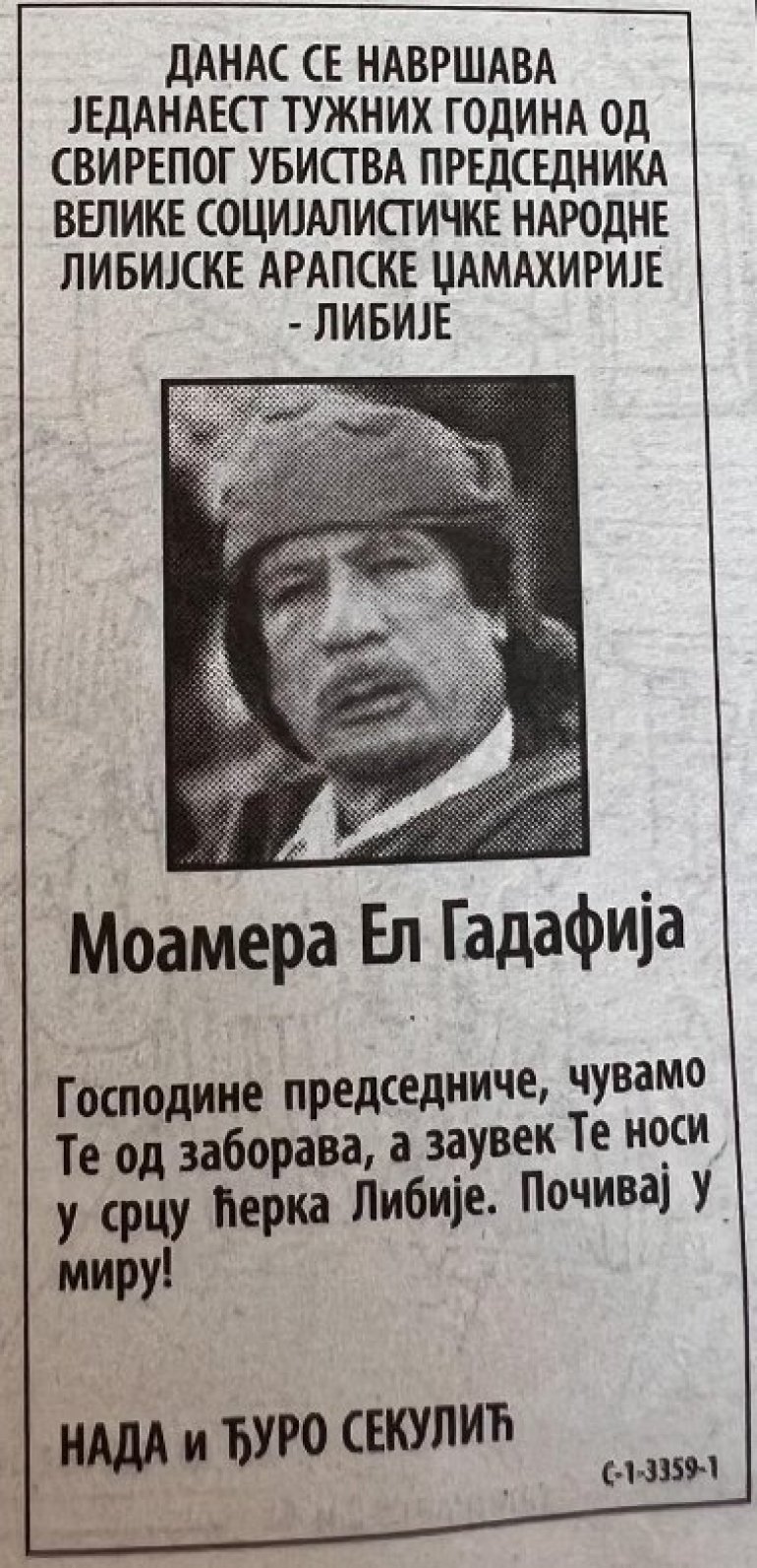ЧИТУЉА ЗА ГАДАФИЈА ОСВАНУЛА У “НОВОСТИМА”: "Чувамо Те од заборава, а заувек Те носи у срцу ћерка Либије"