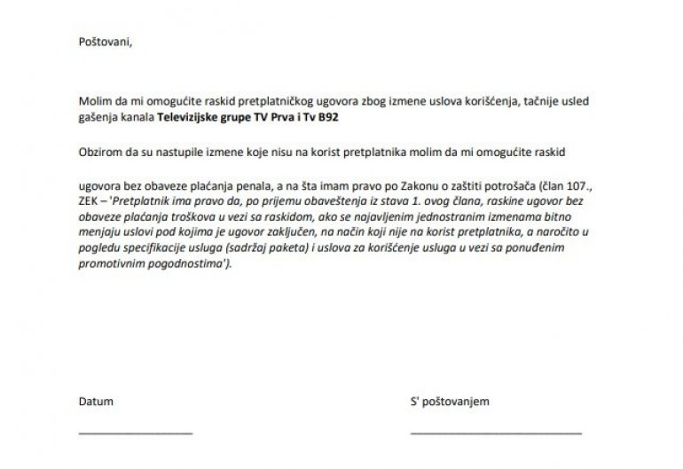 С обзиром на то да су наступиле измене под којима се мења садржај пакета за који сам закључио уговор бр _________, и измене нису на моју корист, да сте пропустили да обавестите, најмање 30 дана унапред, о намери да битно промените услове под којим је уговор закључен, што укључује и понуду програмске шеме на основу које сам се определио за _______ пакет и да ваше обавештење није садржало поуку о праву на раскид због битне промене услова под којима је уговор закључен, молим да ми омогућите раскид без обавезе плаћања пенала, а на шта имам право по Закону о заштити потрошача.
