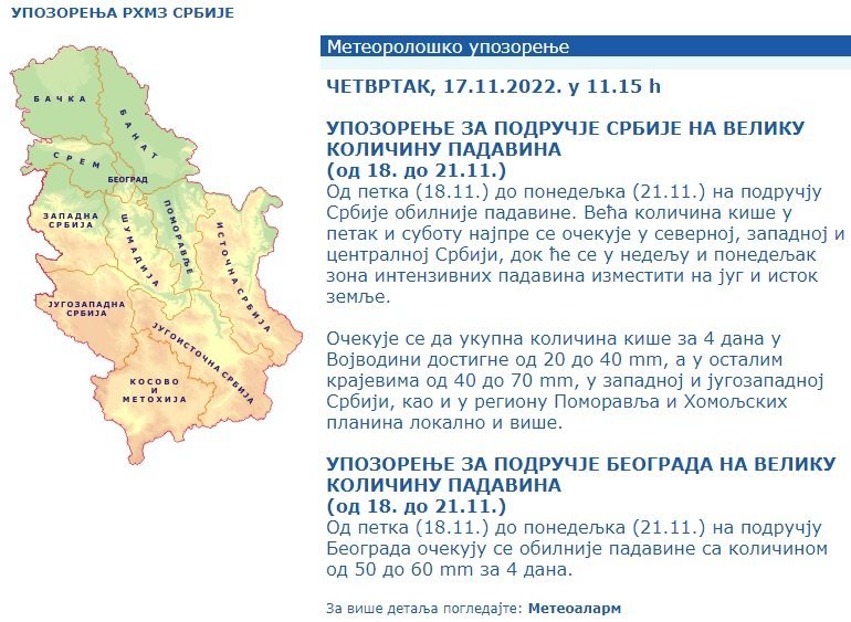 Очекује се да укупна количина кише за четири дана у Војводини достигне од 20 до 40 мм, а у осталим крајевима од 40 до 70 мм, у западној и југозападној Србији, као и у региону Поморавља и Хомољских планина локално и више.