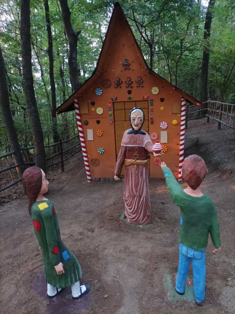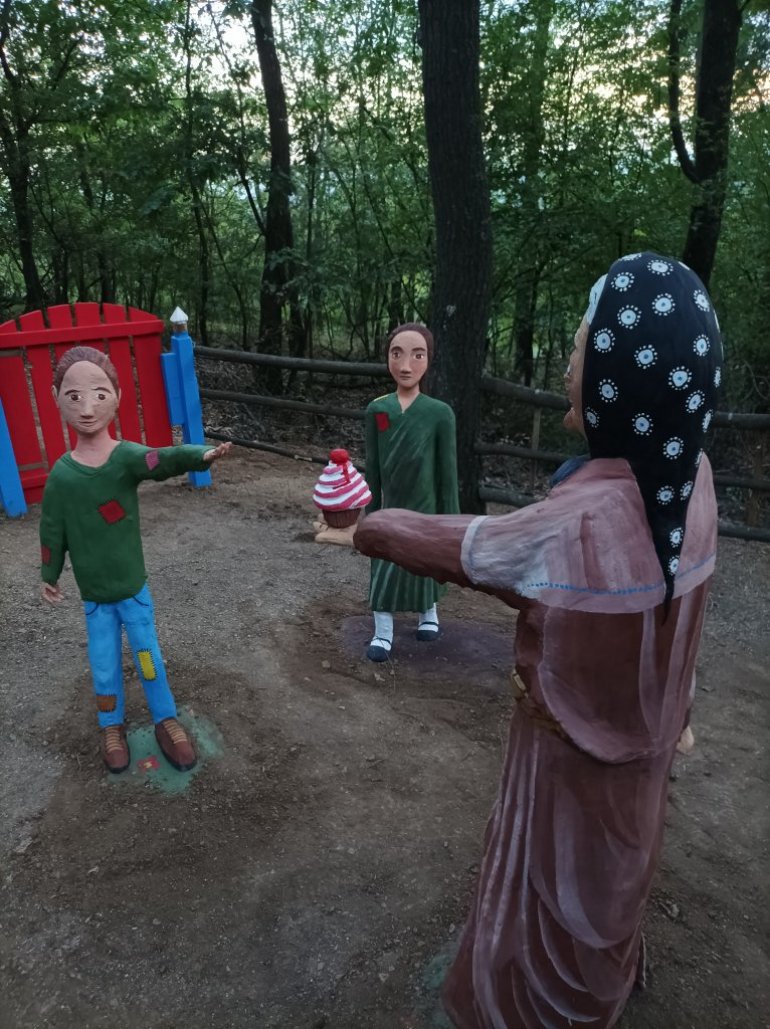 "Вештичина" кућица је ограђена, да неко (не)намерно не оштети ту "баку", или "Ивицу" и "Марицу", друге експонате... Свако их може разгледати и снимати, са спољне стране. Кућица је израђена од металне конструкције, кров од дрвених ОСБ табли и тегола. За скулптуре, прво је изварена конструкција, на њу додато метално сито, преко тога свежи малтер који је Иво Цар затим извајао, па осликао.