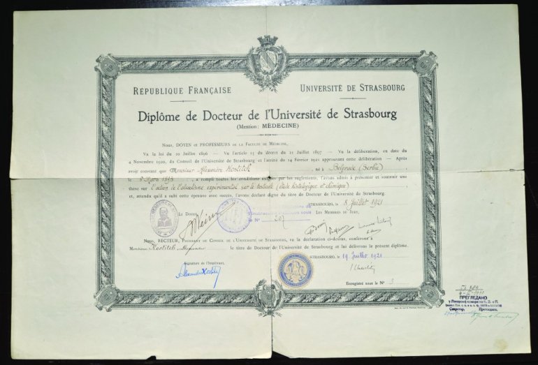 Диплома о положеној докторској дисертацији у Стразбуру/Фото: Документација Легата др Александра Костића; Архив „Новости“; Википедија; Архив института за хистологију и ембрологију; Дигитална архива ЦИБИД Медицинског факултета и Архив АВА САНУ