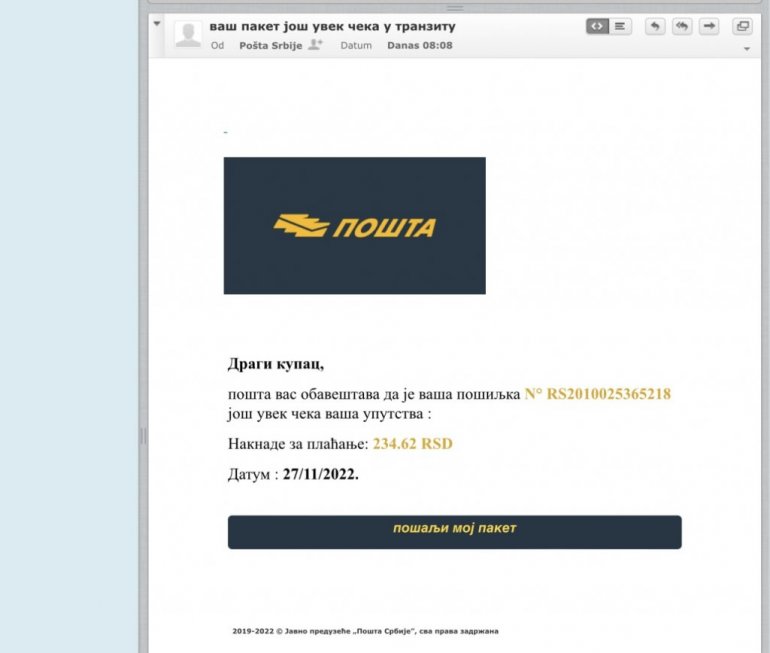 - Драги купац, пошта вас обавештава да је ваша пошиљка РС 2010025365218 још увек чека ваша упутства. Накнада за плаћање 234,62 РСД – пише у мејлу.