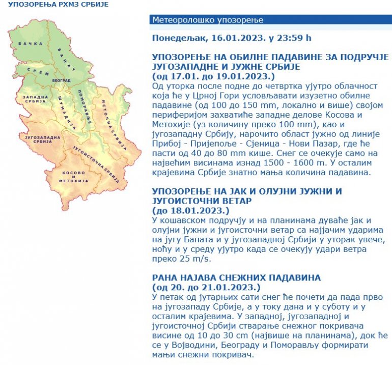 - Од уторка после подне до четвртка ујутро облачност која ће у Црној Гори условљавати изузетно обилне падавине (од 100 до 150 мм, локално и више) својом периферијом захватиће западне делове Косова и Метохије (уз количину преко 100 мм), као и југозападну Србију, нарочито област јужно од линије Прибој - Пријепоље - Сјеница - Нови Пазар, где ће пасти од 40 до 80 мм кише. Снег се очекује само на највећим висинама изнад 1500-1600 м. У осталим крајевима Србије знатно мања количина падавина - наводи се у упозорењу за падавине за подручје југозападне и јужне Србије.