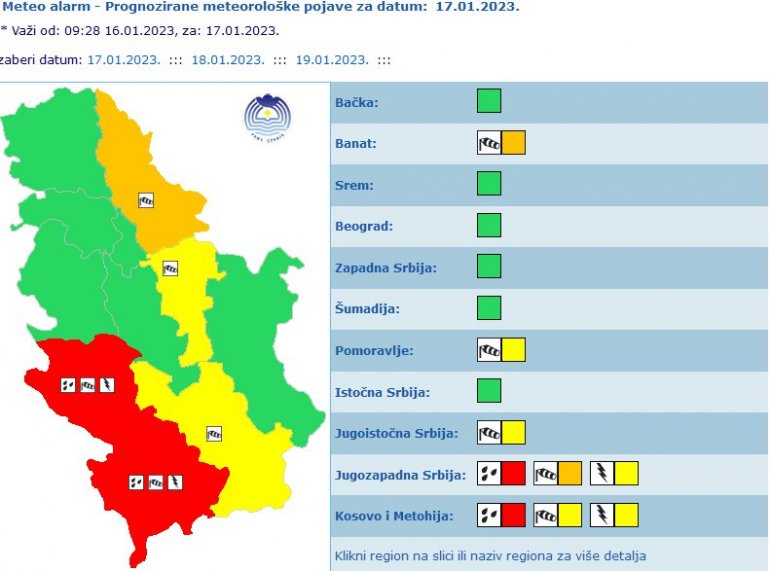 ЦРВЕНИ метеоаларм упаљен је у два краја Србије, у југозападној и на Косову и Метохији, док је у Банату на снази наранџасти.