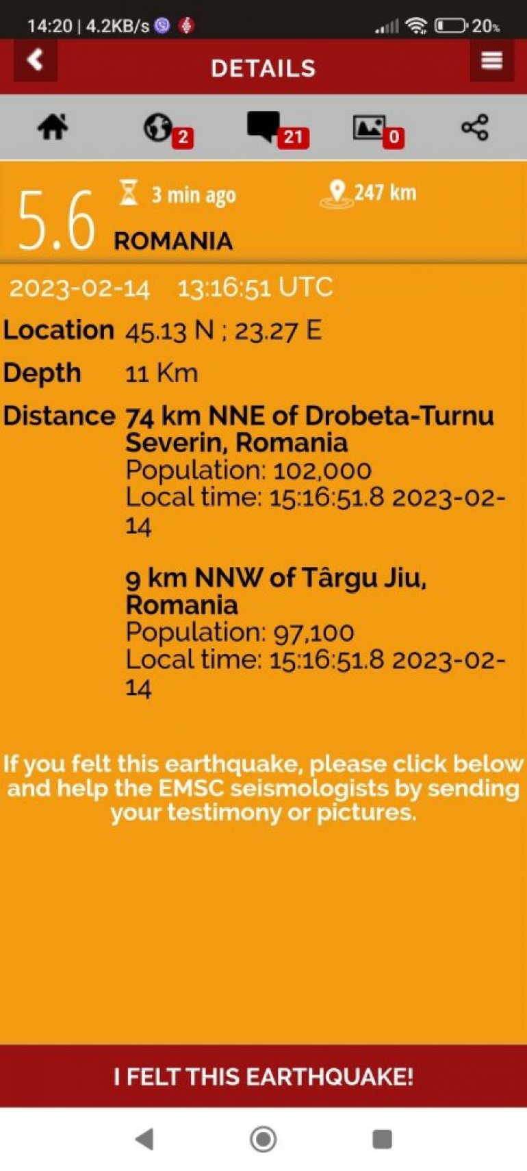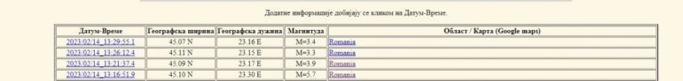 На сајту Републичког сеизмолошког завода објављена је информација о још једном земљотресу јачине 3,9, који је забележен у Румунији.