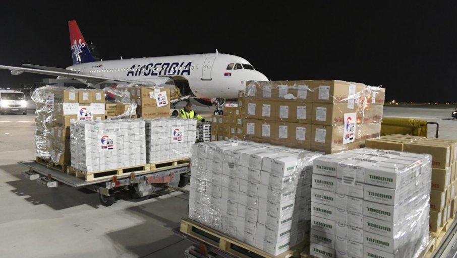 Авион „Ер Србије“ понео је око шест тона намирница и хране, а отпремању хуманитарне помоћи присуствовао је, у име Владе Републике Србије, потпредседник Владе и министар одбране Милош Вучевић.