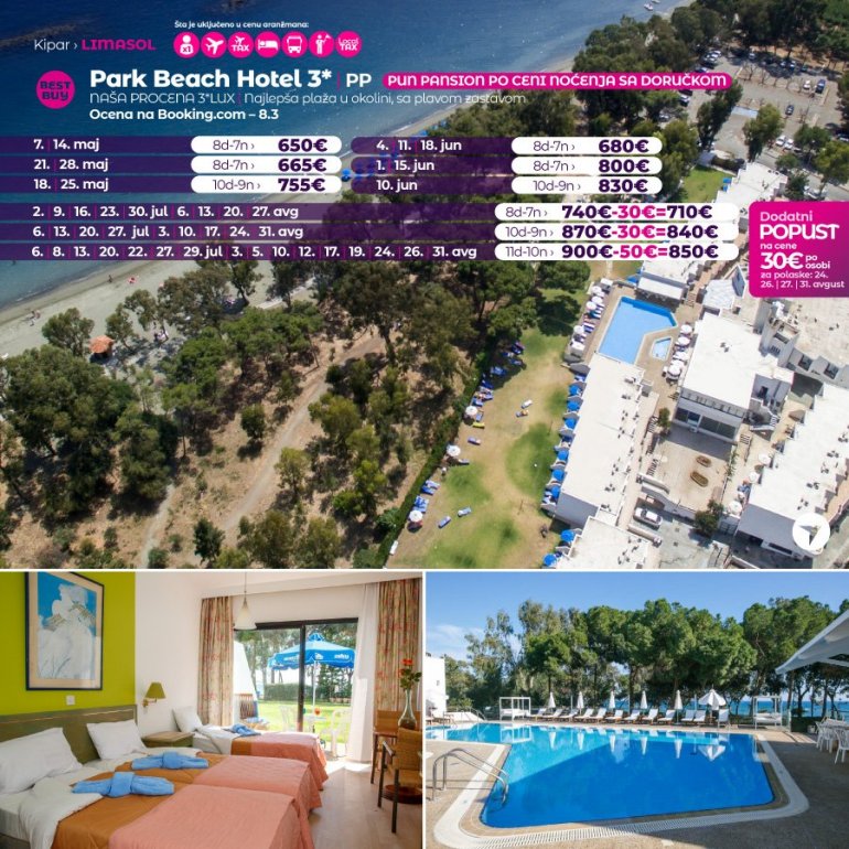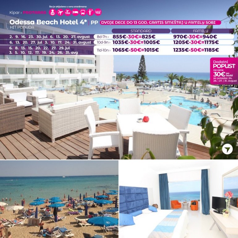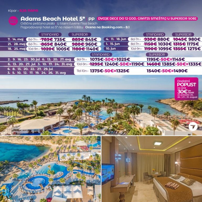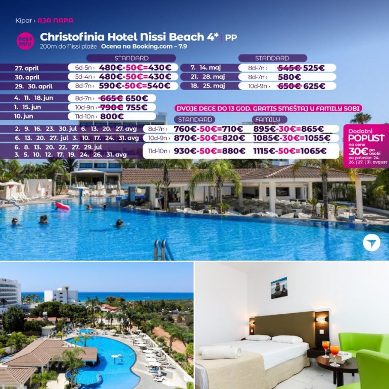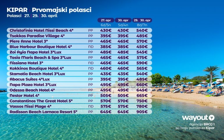 Дефинитивно нова омиљена летња дестинација наших туриста, свакако јесте рајско острво Кипар. Осетите чари Медитерана, фантастичних плажа, веома квалитетних хотела, изузетне гастрономске понуде, као и незаборавног ноћног провода. За наше путнике смо спремили одличну фирст минуте понуду са пажљиво изабраним хотелима, како на основу пређашњих искустава наших клијената, тако и на основу одличних оцена на туристичким порталима.