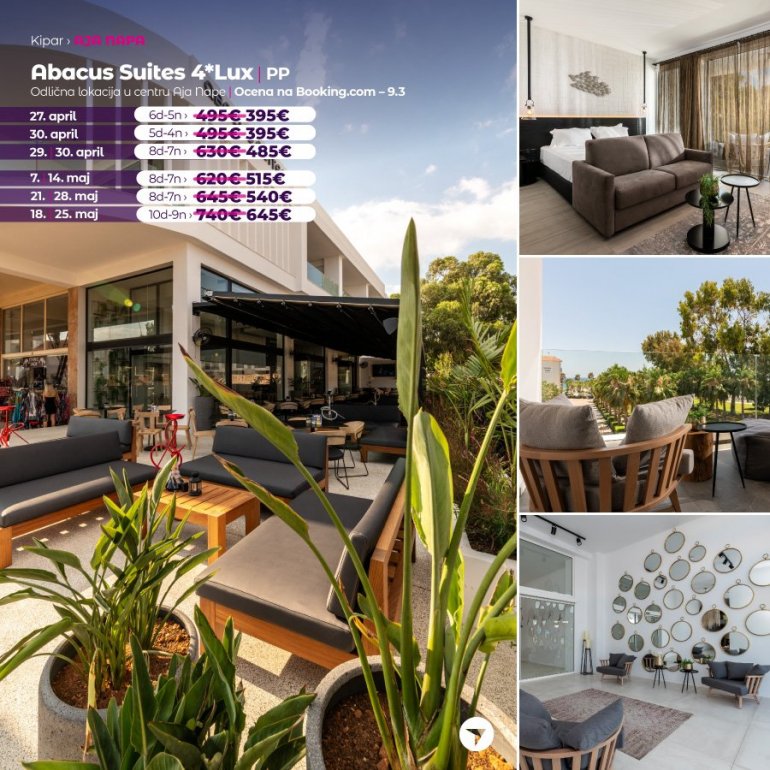 Abacus Suites је потпуно нов хотел, са највишим оценама на туристичким порталима. Изузетно је лоциран, на неколико минута хода од центра Аја Напе и плаже. У непосредној близини хотела налазе се ресторани, кафићи, барови, продавнице и станица градског превоза. Идеалан је избор како за парове, тако и за породице, због пространих соба и услуге која може бити полупансион или all inclusive.