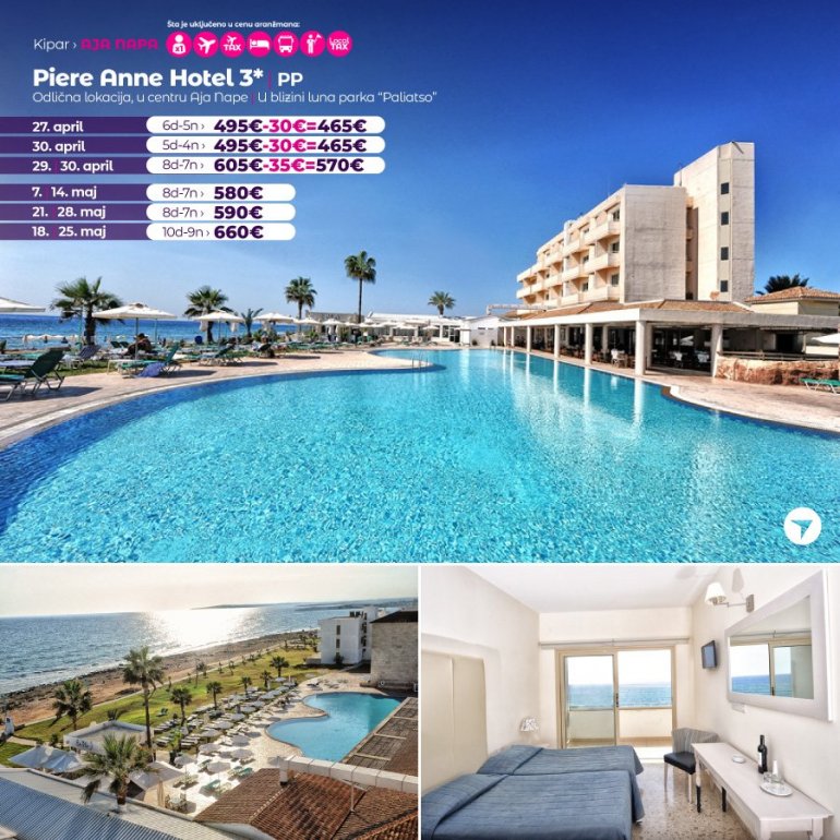 Хотел Piere Anne има одличну локацију на обали мора, на 5 минута од центра Аја Напе и на 5 минута од луке и плаже. Забавни парк Parko Paliatso Fun се такође налази одмах иза хотела, заједно са чувеном улицом Nissi Avenue. У непосредној близини налазе се продавнице, барови и ресторани, а сви садржаји Аја Напе су на дохват руке. Хотел Piere Anne се састоји од 3 блока соба са 2 велика отворена базена.Базени имају директан приступ стази уз море, а бар поред базена "Ен Пло" је одлично место за опуштање током дана. Иако хотел нема много садржаја на лицу места, Piere Anne је толико близу свега у Аја Напи да је одлична база за забаву на плажи или провод у клубовима., као и одмор уз Медитеран.