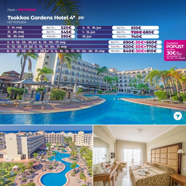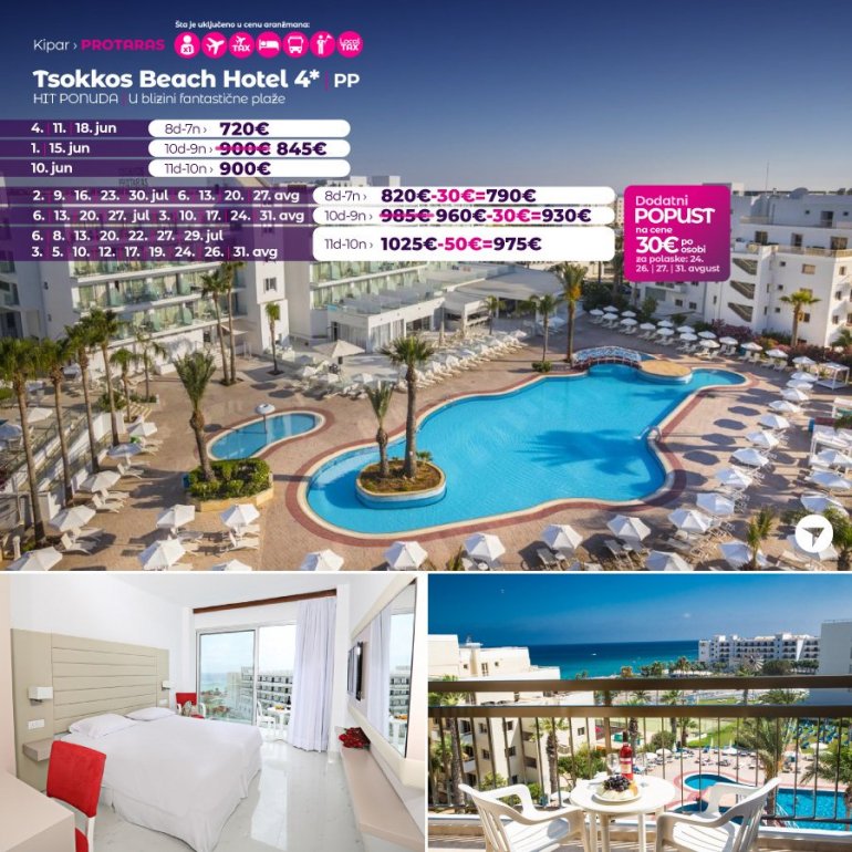 На само 150 м од плаже, у центру Протараса, налази се хотел Tsokkos Beach. Окружен је многобројним ресторанима, продавницама и баровима, а пешачка стаза уз море пролази испред хотела. Осим главног ресторана, у коме се служе оброци по принципу шведског стола, хотел има и кафетрију, бар на базену, базен за одрасле, базен за децу, салу за видео игрице, теретану, анимацију током дана и вечери, тениски терен. Све собе су модерно опремљене, уз доплату је бежични интернет, коришћење електронског сефа и мини фрижидера.