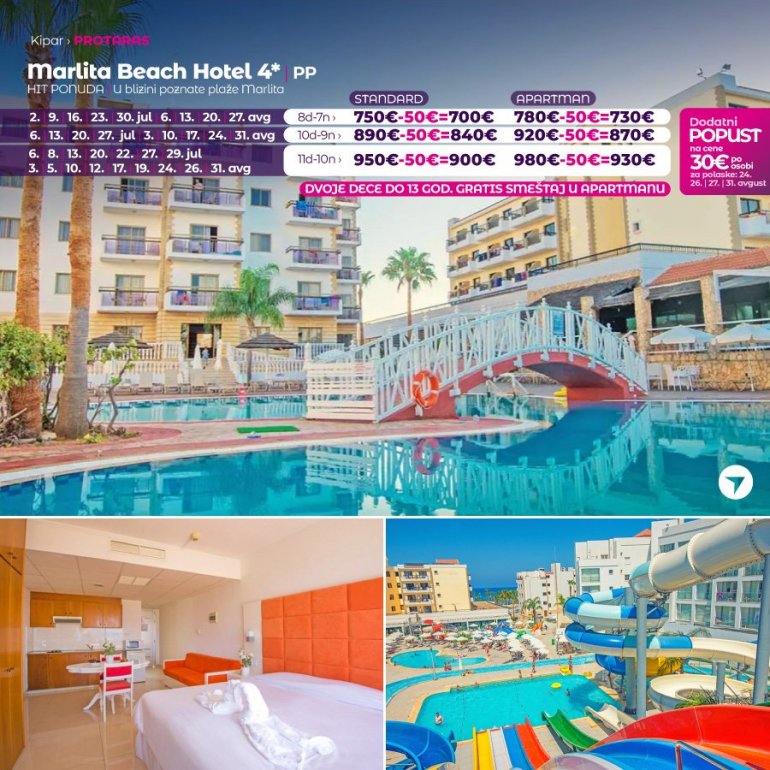 Хотел се налази на Марлита плажи, у регији Пернера, на 15 минута хода од центра Протараса. Marlita Beach Hotel Apartments нуди отворен базен, терасу за сунчање са погледном на море и медитерански ресторан. Апартмани и студији су модерно уређени, са чајном кухињом и простором за седењ. У склопу смештајних јединица налази се и купатило са кадом, тоалетним прибором и феном за косу. САТ ТВ и сеф су доступни. Гости могу да користе хотелски ресторан и водени парк који се налази на неколико минута хода од хотела. За децу су ту игралише, дечији базен и опрема за игру на отвореном. Од плаже Тринитy смештај је удаљен око 2.5км, док је од аеродрома Ларнака удаљен 47км.