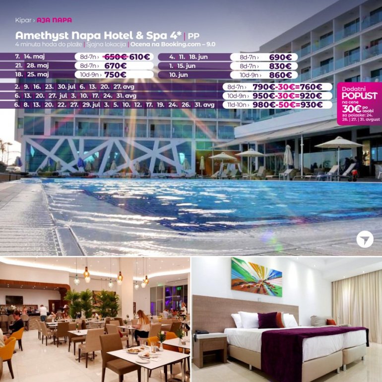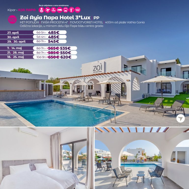 Представљамо вам хотел који средином јуна отвара своја врата за госте. У питању је потпуно нов хотел на одлицној локацији. Налази се у Аја Напи, на 15 минута сетње од центра овог места и у близини плазе Vathia Gonia. У близини хотела налази се бројни ресторани, барови и станица градског превоза. Хотел поседује WiFi, бар код рецепције, спољасњи базен и теретану. Собе су модерно опремљене, са АЦ уређајем.